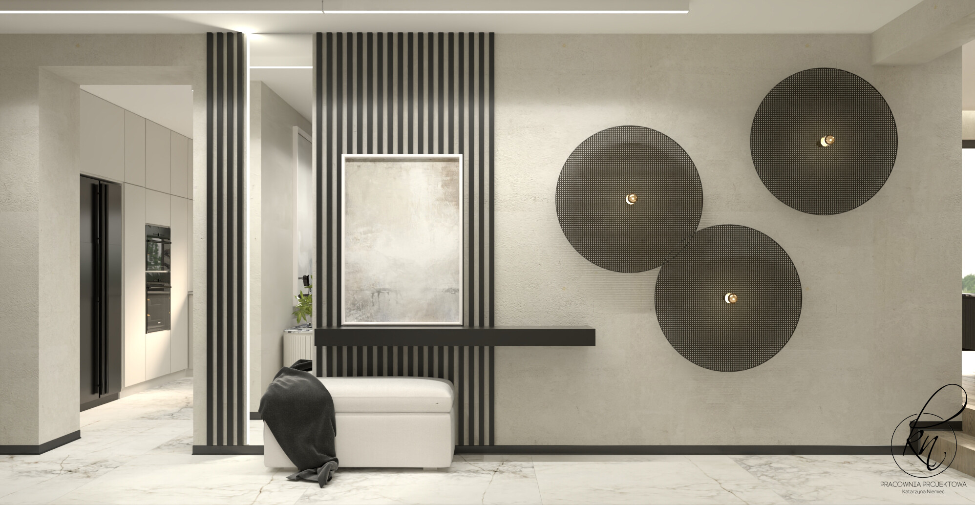 Hol wejściowy stanowi wizytówkę domu. Ryflowane panele, lustra oraz minimalistyczne siedzisko nadają przestrzeni lekkości i porządku. Zastosowane rozwiązania optycznie powiększają wnętrze i płynnie prowadzą do dalszych stref domu.