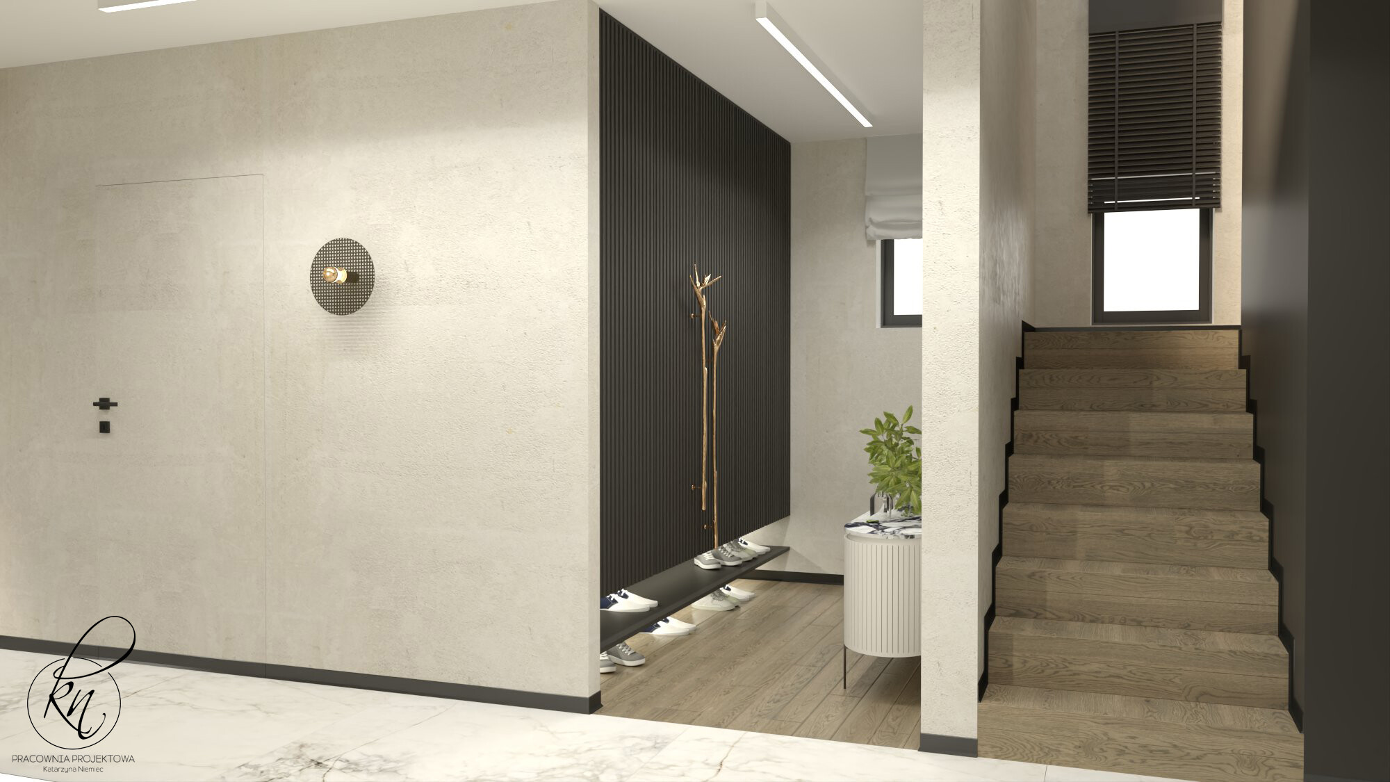 Projekt wnętrz całego domu został zaplanowany w sposób konsekwentny – te same materiały, kolory i detale powtarzają się w kolejnych pomieszczeniach, tworząc harmonijną całość. Duży nacisk położono na funkcjonalność, ergonomię oraz dopasowanie rozwiązań do stylu życia mieszkańców.