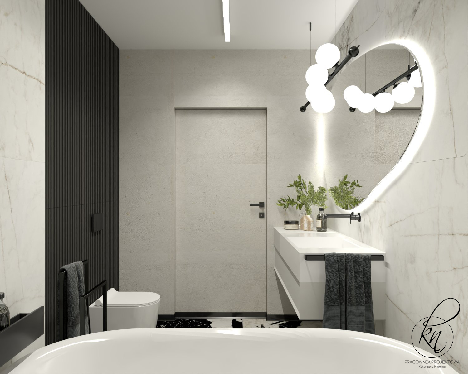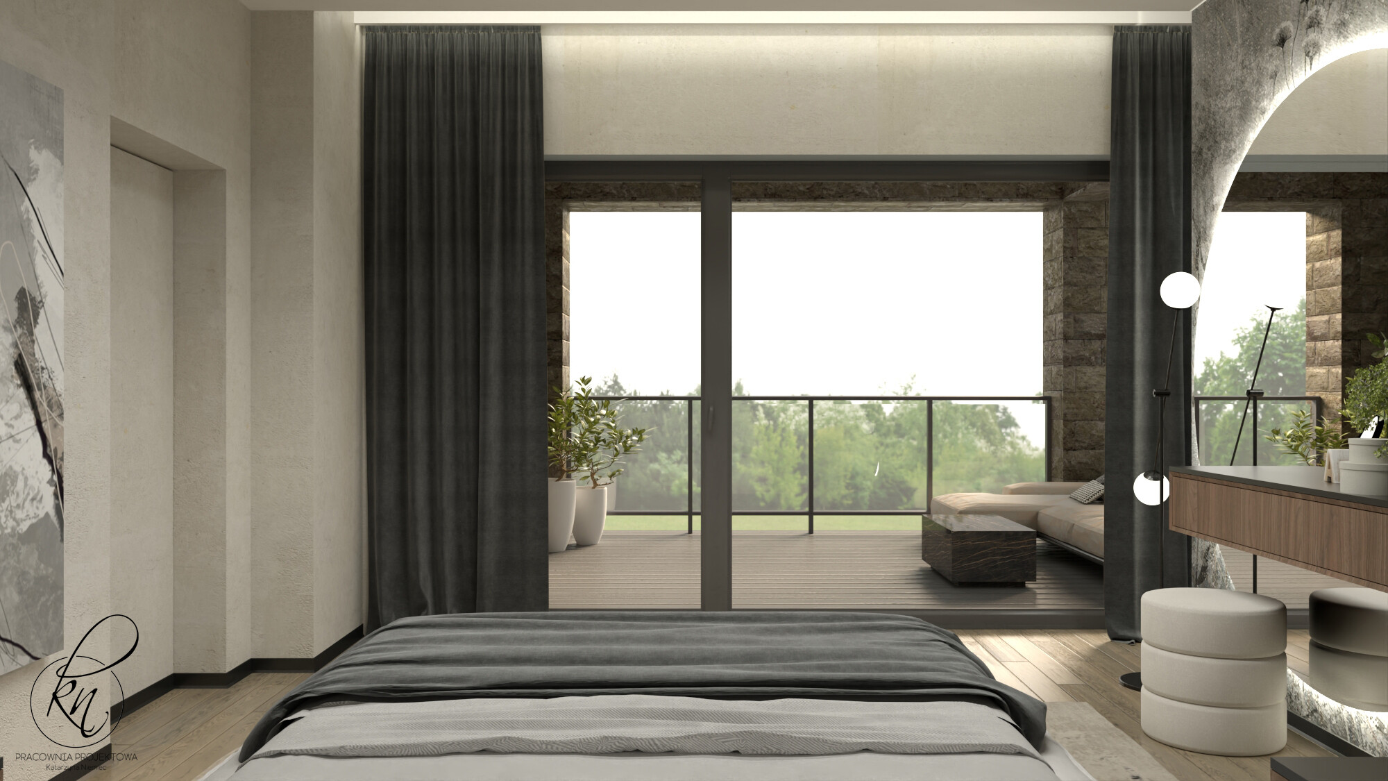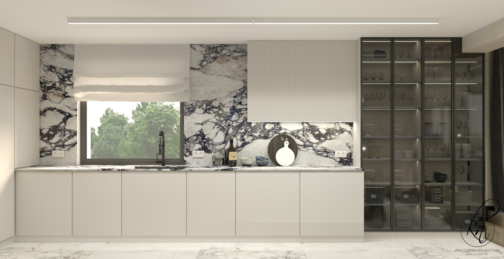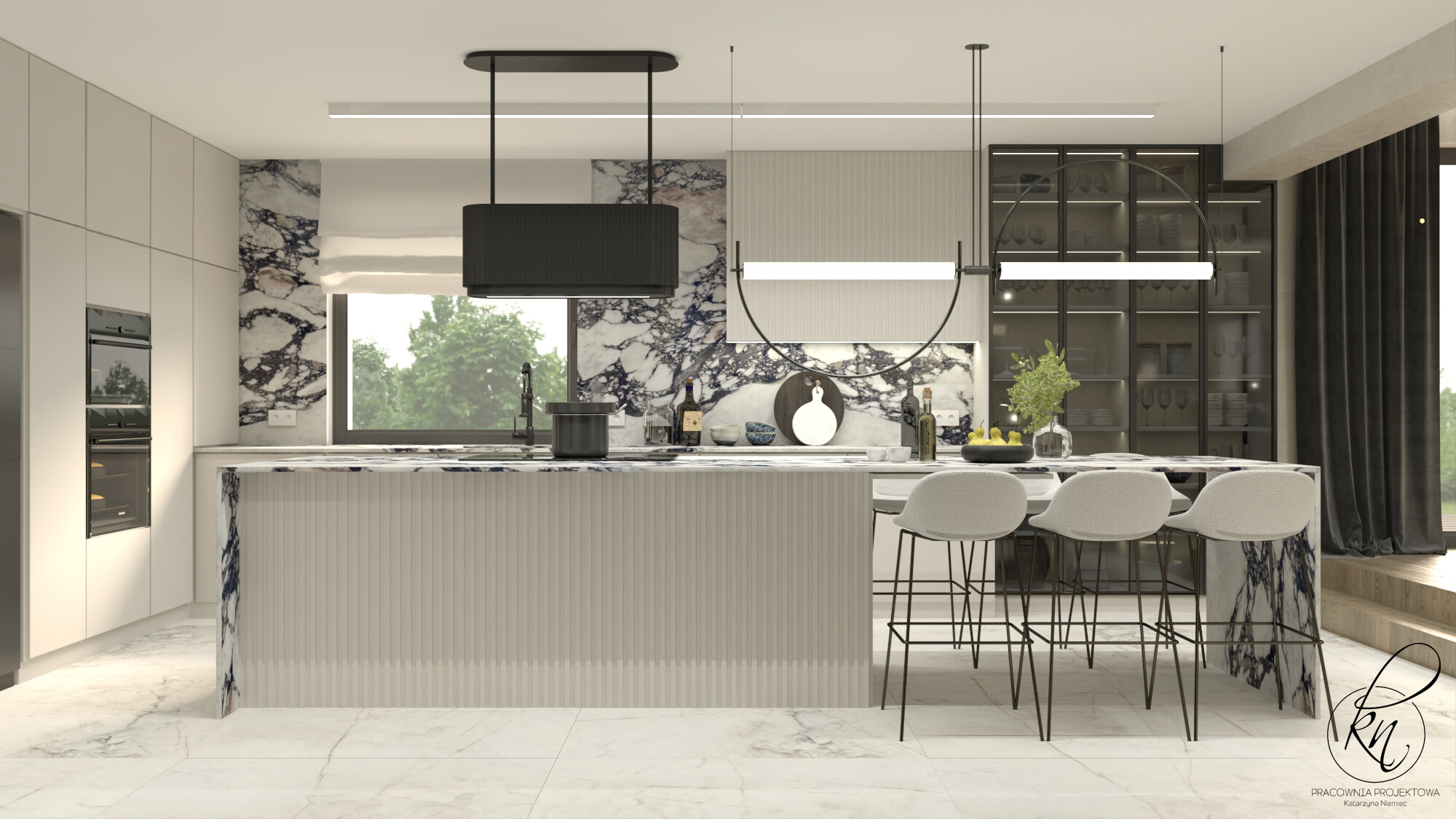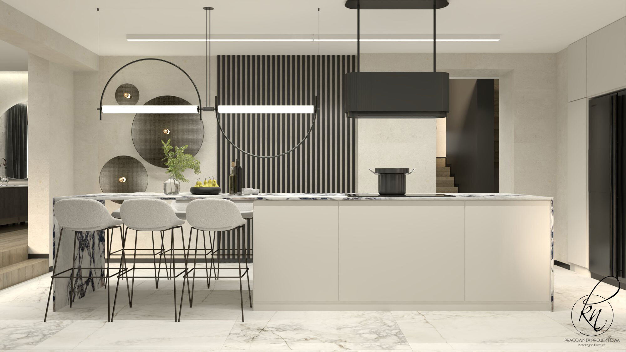 Otwarta strefa dzienna łączy salon, jadalnię oraz kuchnię w jedną, funkcjonalną całość. Kuchnia z wyspą została zaprojektowana jako serce domu – minimalistyczna zabudowa, kamienne blaty oraz dekoracyjne oświetlenie podkreślają nowoczesny charakter wnętrza. Wyspa pełni jednocześnie funkcję miejsca do gotowania i spotkań domowników.