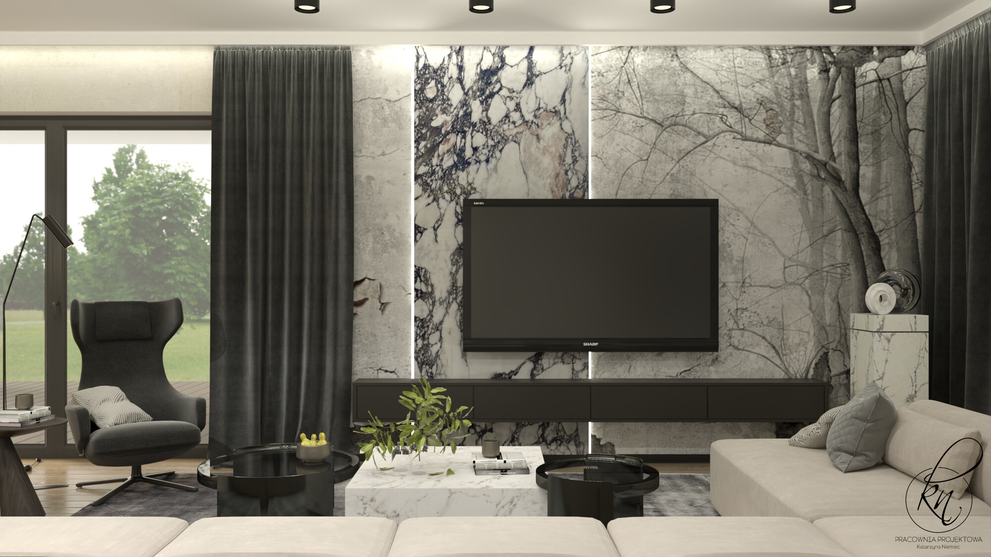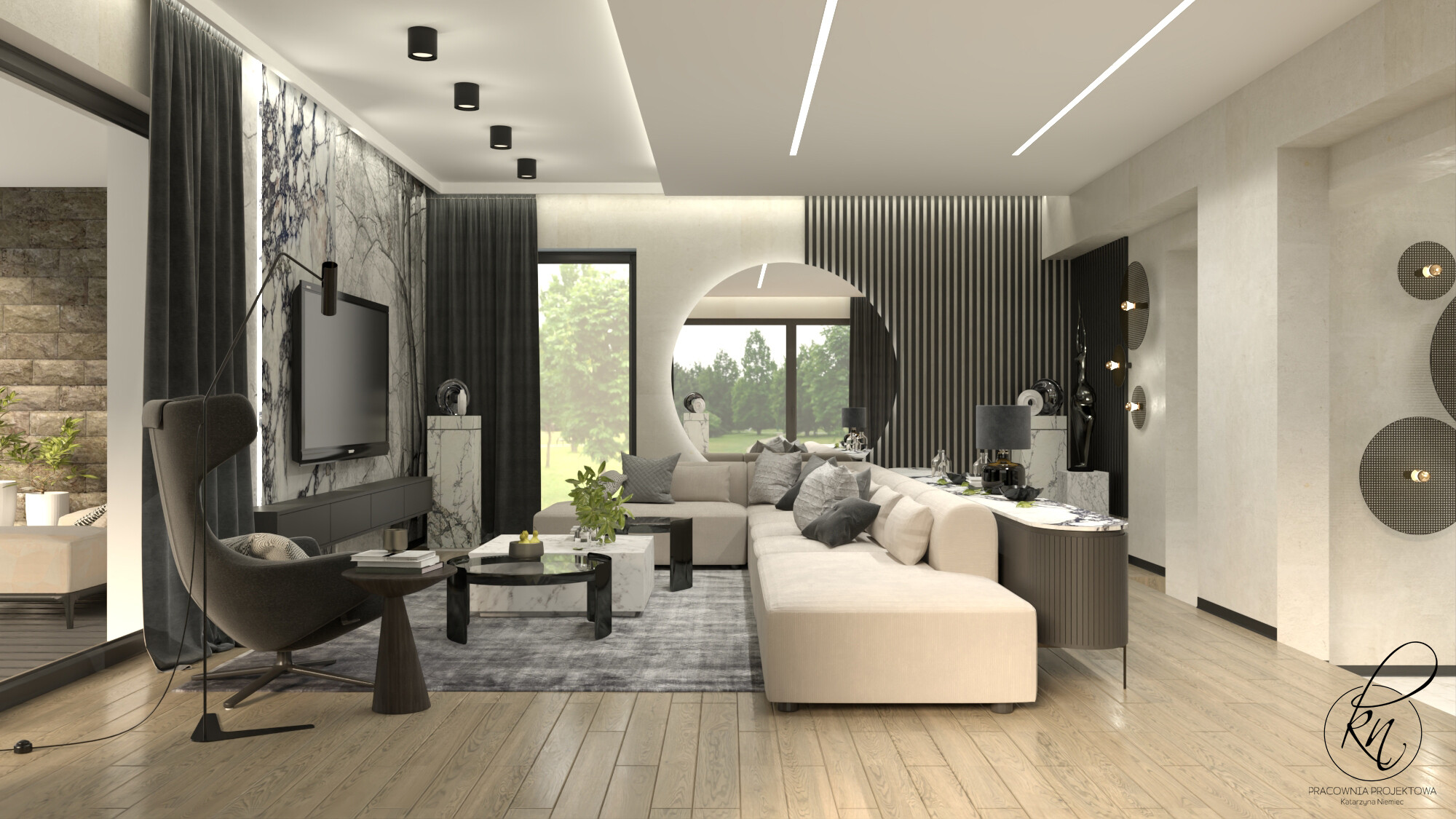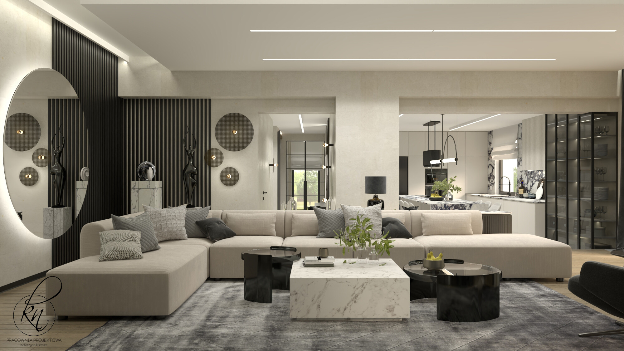 Salon to przestrzeń sprzyjająca wypoczynkowi – duża, modułowa sofa, niskie stoliki z kamienia i szkła oraz miękkie tekstylia tworzą przytulną, ale bardzo elegancką atmosferę. Dekoracyjne elementy ścienne i subtelne światło budują klimat wnętrza zarówno w dzień, jak i wieczorem.